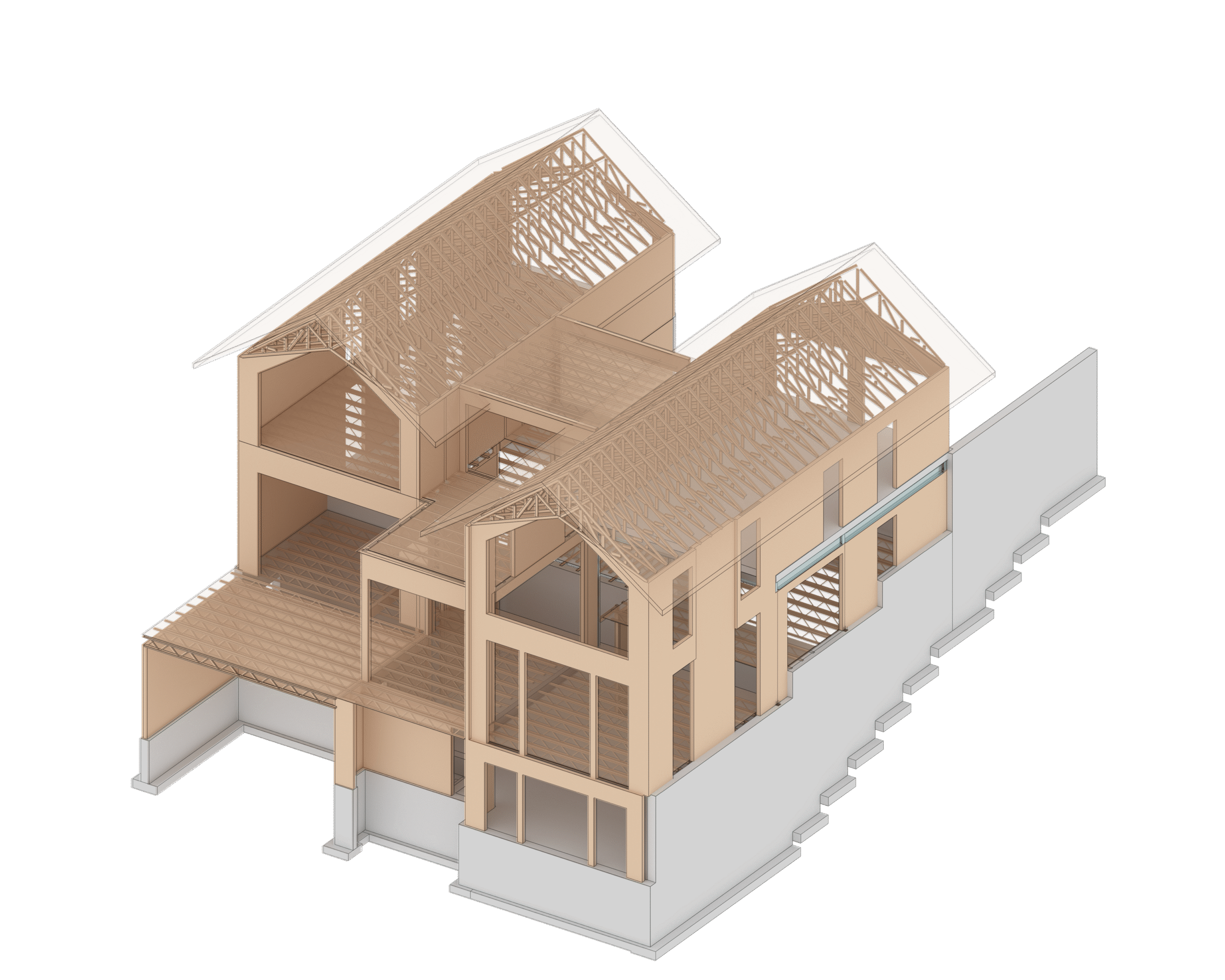 Our team was mandated to design the structural system for this private residence. The uniqueness of the project lies in the steeply sloped site located along a lakeshore. A rigorous engineering approach was implemented to facilitate the installation of the foundations while ensuring overall slope stability. The project also included the design of a structural slab supporting the garage above the living spaces — a technical challenge successfully addressed by our team.